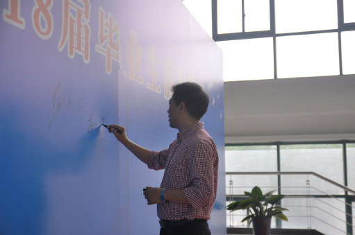 D座大厅内一袭红毯光彩夺目,一直延伸至远处的蓝色大幕布,幕布上“祝2018届毕业生前程似锦”的标语振奋人心,随着活动开启,各专业毕业生依次入场,分列红毯两侧,各系教师着装整洁有礼,伴着毕业生们的热烈掌声走过红毯,来到幕布前签名留念,向毕业生们送上最诚挚的毕业祝福。