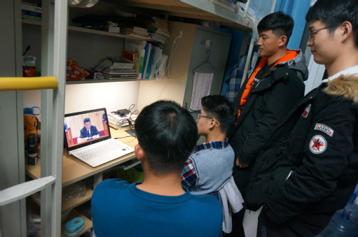 大会伊始,全场奏唱中华人民共和国国歌,各师生全体起立,唱国歌。随后大会对改革开放四十周年来做出卓越贡献的改革先锋做出表彰,观看直播的学生们对每一位出现在荧屏的优秀人物报以掌声。接着,习近平总书记对改革开放的历史记忆进行回顾,对四十年来的成就变革做出评价,对改革开放四十年中国人民取得的进步予以肯定,并对今后的发展路线做出指导。
