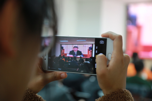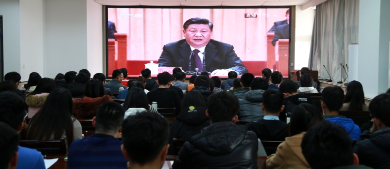 上午10时,储建学院党委书记高平发、党委副书记张程与师生党员代表80余人在工科实验楼D345会议室集中观看大会现场直播。各年级学生、各级学生组织由辅导员、学生会组织在南教楼观看直播。