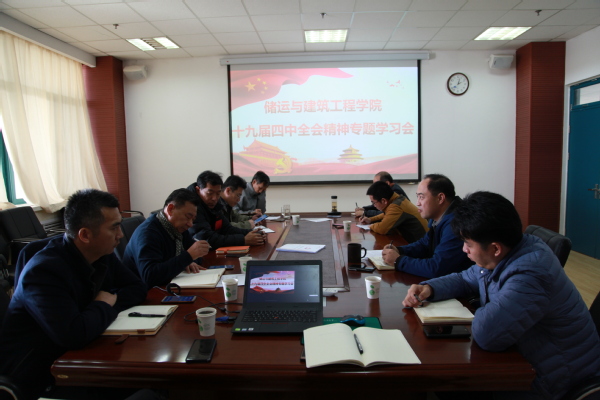 11月25日下午2:00,储建学院在D341会议室召开专题学习会,结合“不忘初心、牢记使命”主题教育,认真学习贯彻党的十九届四中全会精神。会议由党委书记高平发主持,学院党委中心组成员以及办公室主任潘正鸿、院长助理周辉、团委书记李峰弼老师参会学习。