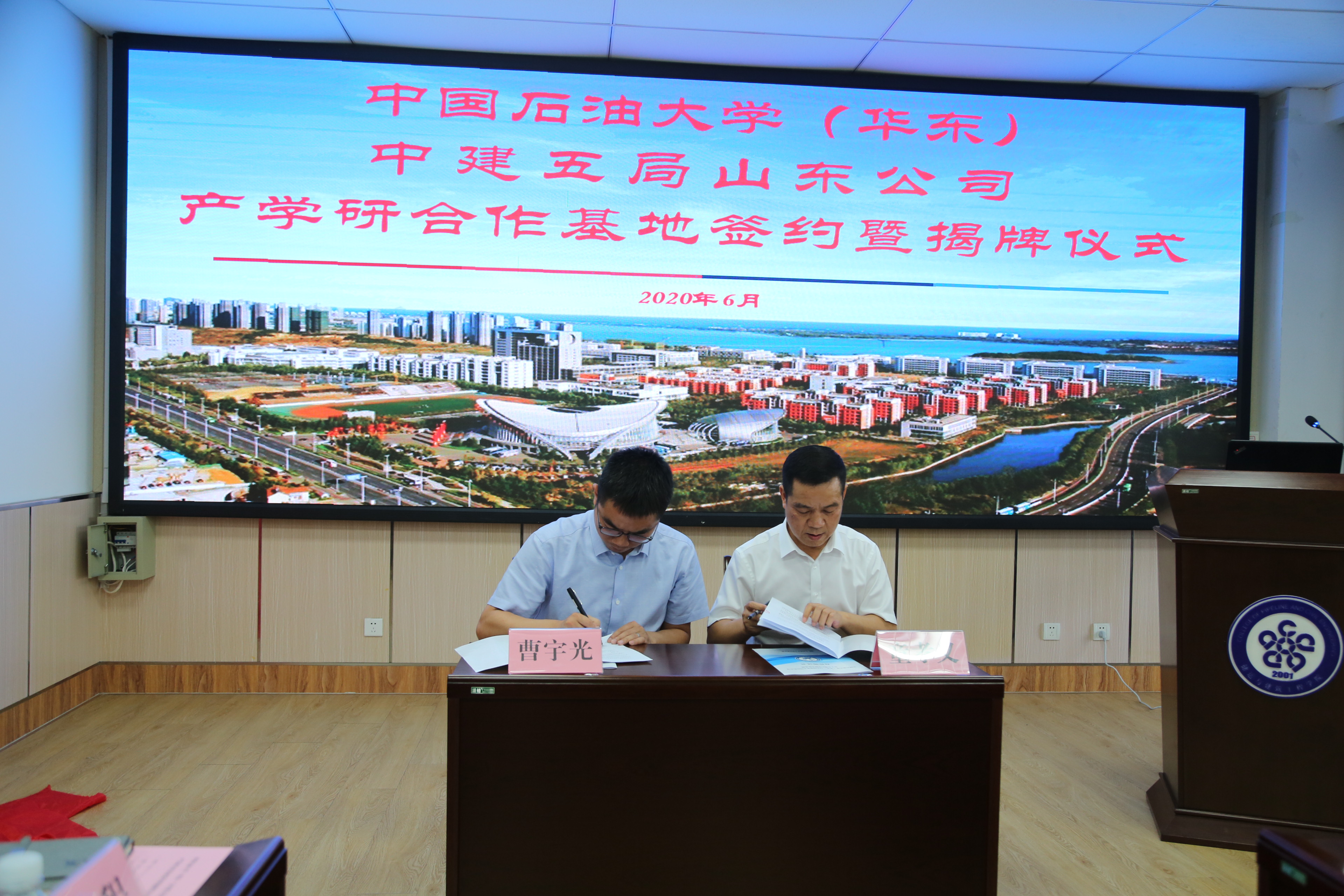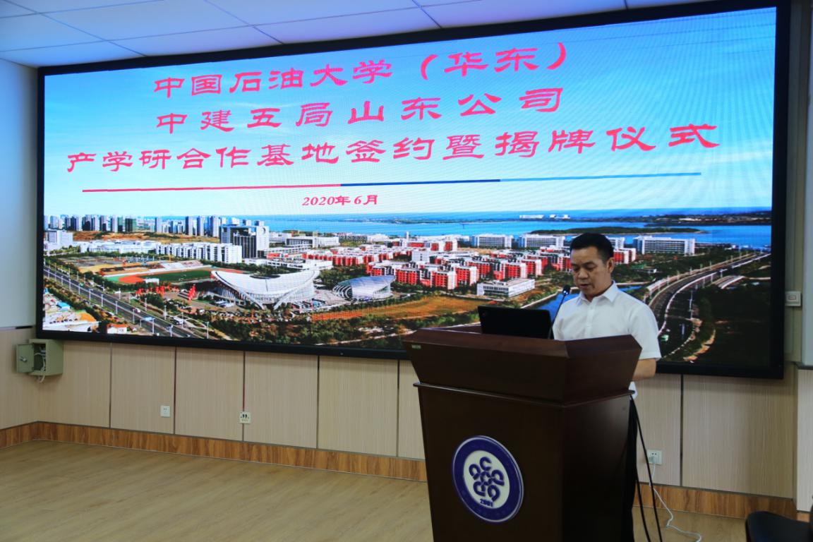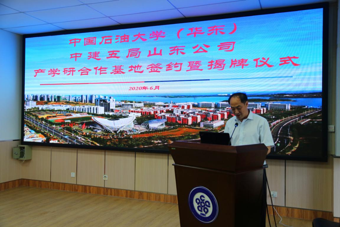学校与中建五局山东公司签署了《中国石油大学与中国建筑五局山东公司关于共建产学研合作基地协议书》,姚军和童孝义共同为“中国石油大学产学研合作基地”揭牌。随后,双方进行座谈交流。