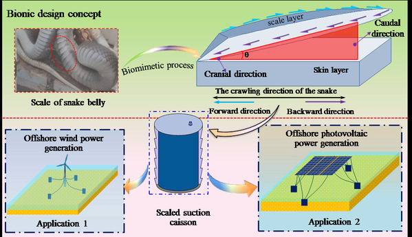 鳞片式吸力基础的仿生灵感启发于蛇类爬行动物前进时阻力减小,后退时阻力增大的原理。在吸力基础的外侧壁采用了仿生蛇腹鳞片结构(简化为蛇腹皮肤层与鳞片所形成的三角区域)。在前期研究中已充分论证鳞片式吸力基础具备降低土塞高度,降低沉贯阻力,消除灌浆工艺及提升服役承载力的效果。寻求最优仿生鳞片桶壁布置方式及揭示沉贯机理是推动鳞片式吸力基础应用的前提。