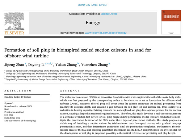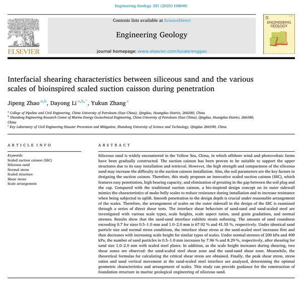 近日,我院李大勇教授团队在海洋能源岩土工程领域中鳞片式吸力基础沉贯特性研究方面取得新进展,相关研究成果《Interfacial shearing characteristics between siliceous sand and the various scales of bioinspired scaled suction caisson during penetration》发表在《Engineering Geology》,《Formation of soil plug in bioinspired scaled suction caissons in sand for offshore wind turbine》发表在《Energy》。《Engineering Geology》和《Energy》分别为工程地质和能源领域顶级期刊(中科院一区Top)。论文第一作者为在读博士生赵继鹏,通讯作者为李大勇教授,中国石油大学为第一署名单位和唯一通讯单位。该研究得到国家自然科学基金面上项目资助。