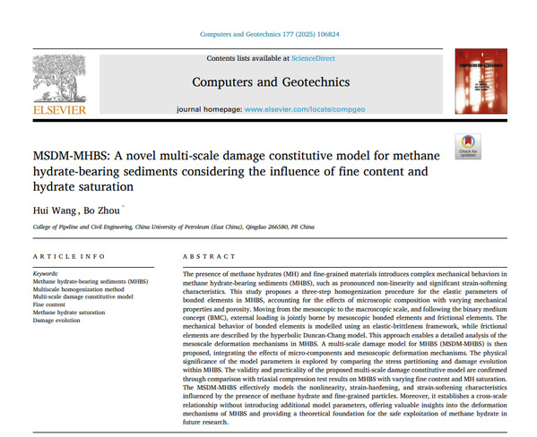 近期,我院周博教授团队在石油与地质工程领域的力学理论与数值方法等方面取得新进展。相关研究成果以“MSDM-MHBS: A novel multi-scale damage constitutive model for methane hydrate-bearing sediments considering the influence of fine”发表在期刊《Computers and Geotechnics》(SCI,中科院1区);以“A semi-analytical method for the stress distribution around a borehole with multiple casings and cement sheaths”和“Mechanical model of the casing sidetracking tool system considering weight on bit and axial displacement”发表在期刊《Geoenergy Science and Engineering》(SCI,中科院2区);以“Numerical and experimental study on the performance of an electromagnetic energy harvester distributed along drill-string”发表在期刊《International Journal of Mechanical Sciences》(SCI,中科院1区);以“A novel shear damage model of the shear deformation and failure process of gas hydrate-bearing sediments”发表在期刊《Journal of Zhejiang University-Science A》(SCI,中科院2区)。
