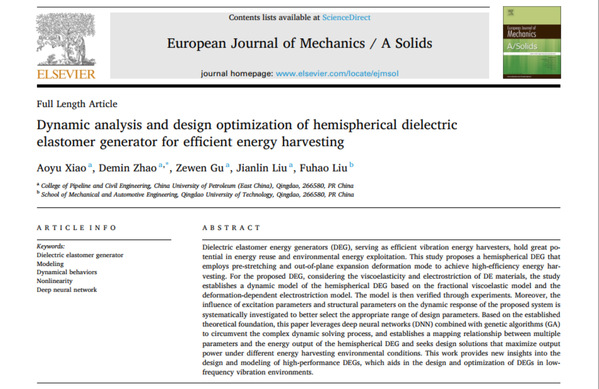 近日,我院赵德敏副教授团队在智能材料波能发电理论和实验研究方面取得新进展,相关研究成果《高效能量收集的介电弹性体发电机振动分析与优化设计》(Dynamic analysis and design optimization of hemispherical dielectric elastomer generator for efficient energy harvesting)发表在《European Journal of Mechanics/A Solids》(固体力学领域的国际顶级期刊,SCI二区)。论文第一作者为硕士研究生肖奥宇,通讯作者为赵德敏副教授,中国石油大学为第一署名单位和唯一通讯单位。该研究得到国家自然科学基金面上项目及山东省自然科学基金项目、中央高校基本科研业务费项目的联合资助。