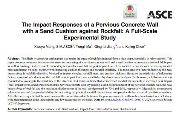 我院教师孟晓宇在高边坡落石灾害防护结构研究领域取得新进展,相关研究成果《The Impact Responses of a Pervious Concrete Wall with a Sand Cushion against Rockfall: A Full-Scale Experimental Study》发表在《ASCE International Journal of Geomechanics》。发表期刊为岩土工程领域著名期刊。论文第一作者为孟晓宇老师,中国石油大学为第一署名单位。该研究得到了国家重点研发计划及国家自然科学基金资助。
