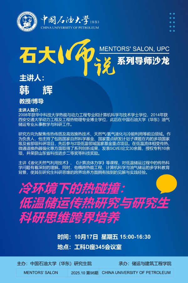 【预告】“石大师说”系列导师培训交流沙龙活动—冷环境下的热碰撞:低温储运传热研究与研究生科研思维跨界培养