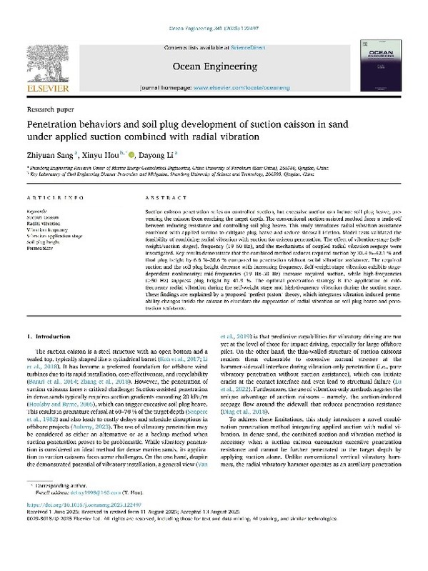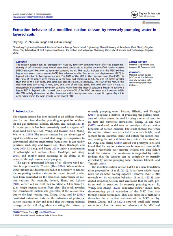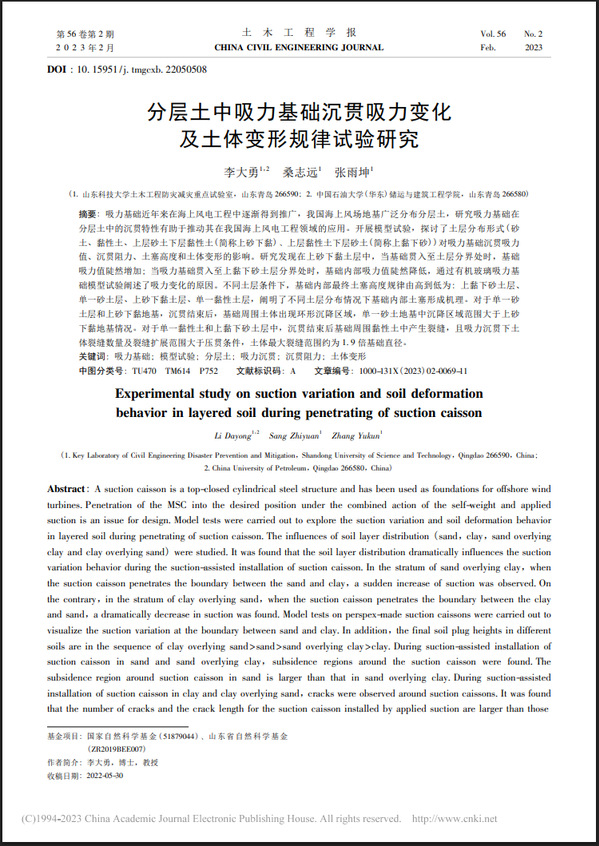 近日,我院李大勇教授团队在海上风电吸力基础锚固安装领域取得新进展,相关研究成果《分层土中吸力基础沉贯吸力变化及土体变形规律试验研究》,《Extraction behavior of a modified suction caisson by reversely pumping water in layered soils》和《Penetration behaviors and soil plug development of suction caisson in sand under applied suction combined with radial vibration》分别发表在《土木工程学报》,《Marine Georesources & Geotechnology》和《Ocean Engineering》。《土木工程学报》是土木工程领域国内顶级EI期刊(卓越期刊),《Marine Georesources & Geotechnology》是海洋工程领域国际著名期刊,《Ocean engineering》是海洋工程领域国际顶级期刊(SCI二区top)。论文第一作者分别为李大勇老师以及博士生桑志远。中国石油大学为第一,二署名单位。该研究得到了国家自然科学基金面上项目的资助。