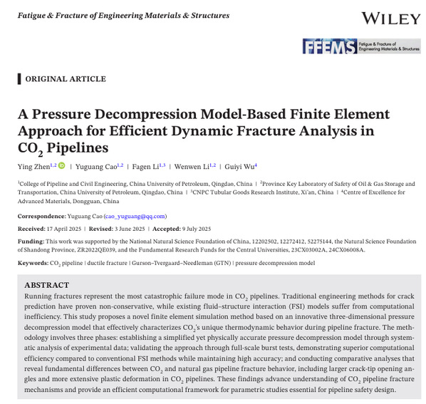 近日,我院甄莹教师团队在超临界二氧化碳止裂控制研究方向取得新进展,相关研究成果《A pressure decompression model-based finite element approach for efficient dynamic fracture analysis in CO₂ pipelines》发表在《Fatigue & Fracture of Engineering Materials & Structures》。论文第一作者为甄莹老师,通讯作者为曹宇光教授,中国石油大学为第一署名单位和唯一通讯单位。该研究得到国家自然科学基金面上项目及山东省自然科学基金项目、中央高校基本科研业务费项目的联合资助。