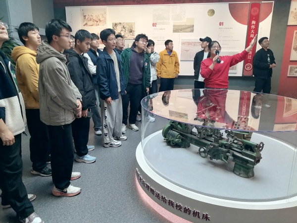团支部成员聆听讲解员讲述周总理赠送机床的故事 张彧涵摄
