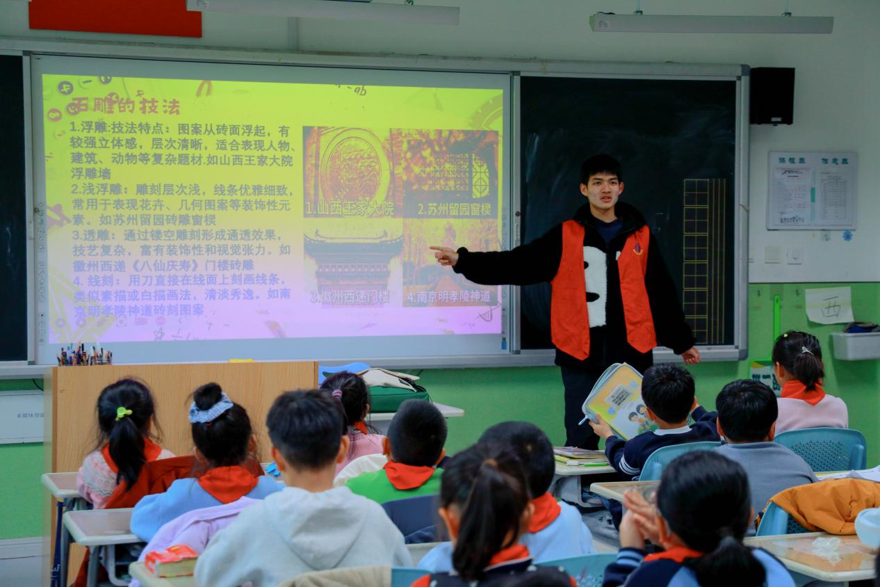 活动伊始,志愿者团队分工协作,打造兼具知识性与趣味性的讲解课堂。主讲人刘统铭带领学生追溯砖雕的千年历史:从最初的汉代画像砖的墓葬装饰,到宋元时期走进民居与宗教建筑,再到明清时期徽派、苏派、晋派等地域风格发展,学生清晰感知到砖雕艺术的传承脉络。