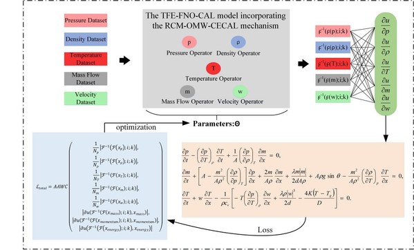 天然气管道瞬变仿真的核心在于求解由质量、动量及能量守恒定律构成的偏微分方程组,并辅以气体状态方程、摩阻系数计算及热物性参数(如焓、熵、比热容)等常微分方程。传统方法在每一时间步计算物性参数时,通常需为当前步赋予初始猜测值,通过迭代修正实现收敛,属于典型的“预估-校正”流程,计算开销较大。此外,现有基于傅里叶神经算子的方法仍存在两方面局限:一是未能依据输入动态调整不同频域成分的权重,二是忽略了频域信号沿时间维度的依赖关系。另一方面,纯数据驱动的算子模型易陷入仅满足数值精度而偏离物理约束的解空间,导致其外推泛化能力不足。