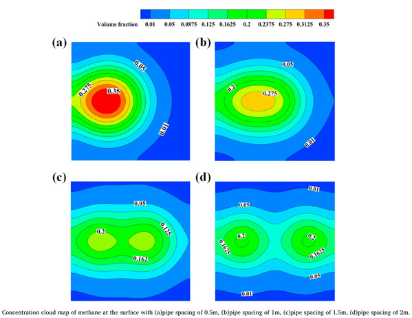 在双管道泄漏场景中,管道水平间距从 0.5m 增至 2m 时,地表甲烷最大浓度从 35% 降至 20%,但气体横向入侵距离从 2.89m 增至 4m,警戒区与危险区范围扩大;间距较小时(0.5m、1m),地表最大浓度出现在两泄漏点之间,间距较大时(1.5m、2m)则位于泄漏点正上方。