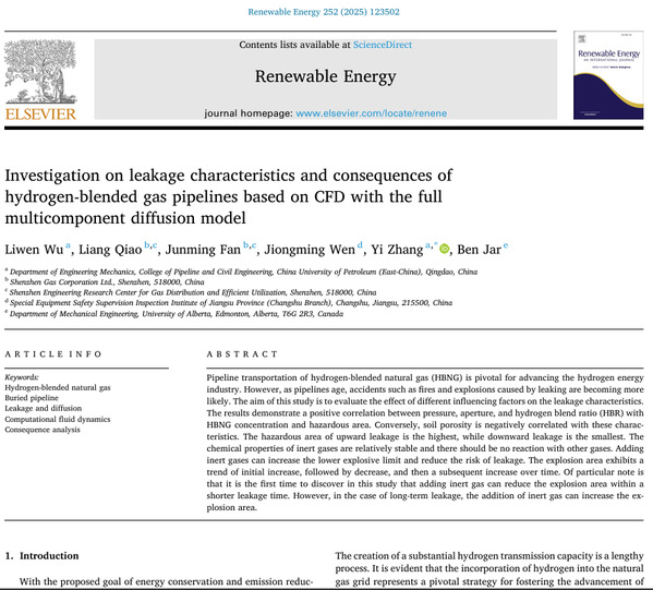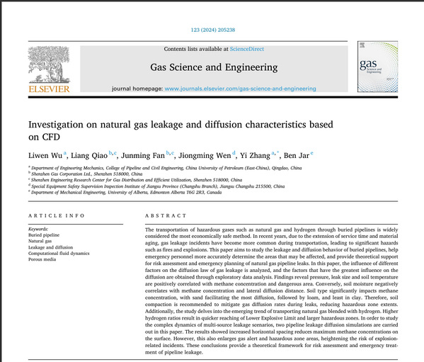 近日,我院力学学科硕士研究生武立文在埋地管道天然气及掺氢天然气泄漏扩散特性研究方面取得系列进展,相关研究成果先后发表于《Gas Science and Engineering》(SCI二区IF 5.5)、《Renewable Energy》(SCI一区IF 9.1)等能源与流体工程领域重要期刊。其中《Investigation on natural gas leakage and diffusion characteristics based on CFD》发表于《Gas Science and Engineering》,《Investigation on leakage characteristics and consequences of hydrogen-blended gas pipelines based on CFD with the full multicomponent diffusion model》发表于《Renewable Energy》。论文第一作者为硕士研究生武立文,通讯作者为张毅副教授,合作作者包括乔亮、 Ben Jar 教授等,中国石油大学为第一署名单位,研究得到国家自然科学基金(11802343)、城市老旧 PE 管道风险评估技术项目(KJ2023005)等项目资助。