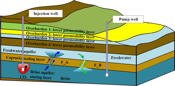 为了研究CO2封存中沿断层的流体运移行为,建立了包含两条断层的三维数值模型,并根据沿断层的流体泄漏速率将过程划分为六个阶段:阶段1盐水沿断层A向上外逸,同时淡水沿断层B向下流失;阶段2盐水沿两条断层向上外逸,淡水仍沿断层B向下流失但逐渐消失;阶段3盐水沿两条断层大量向上外逸,淡水不再向下流失;阶段4 CO2沿断层A向上泄漏,盐水仍沿两条断层向上外逸;阶段5淡水流失再次出现,盐水外逸逐渐减少;阶段6 CO2沿断层A泄漏且淡水沿两条断层向下流失,盐水不再外逸。