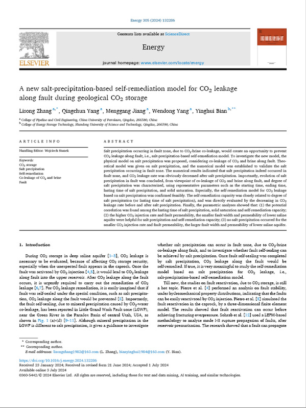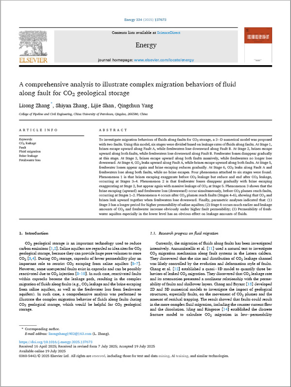 近日,我院张立松副教授团队在CO2地质封存及泄漏机理评价研究方面取得新进展,相关研究成果《A comprehensive analysis to illustrate complex migration behaviors of fluid along fault for CO2 geological storage》、《A new salt-precipitation-based self-remediation model for CO2 leakage along fault during geological CO2 storage》发表在《Energy》;《Effect of layered heterogeneity in saline aquifers on geological CO2 storage》发表在《Fuel》。其中,《Energy》是能源研究领域的国际顶尖期刊(SCI一区TOP),《Fuel》是能源研究领域的国际著名期刊(SCI 二区TOP)。论文第一作者为张立松老师,中国石油大学为第一署名单位。该研究得到山东省自然科学基金项目、中央高校基本科研业务费专项资金联合资助。